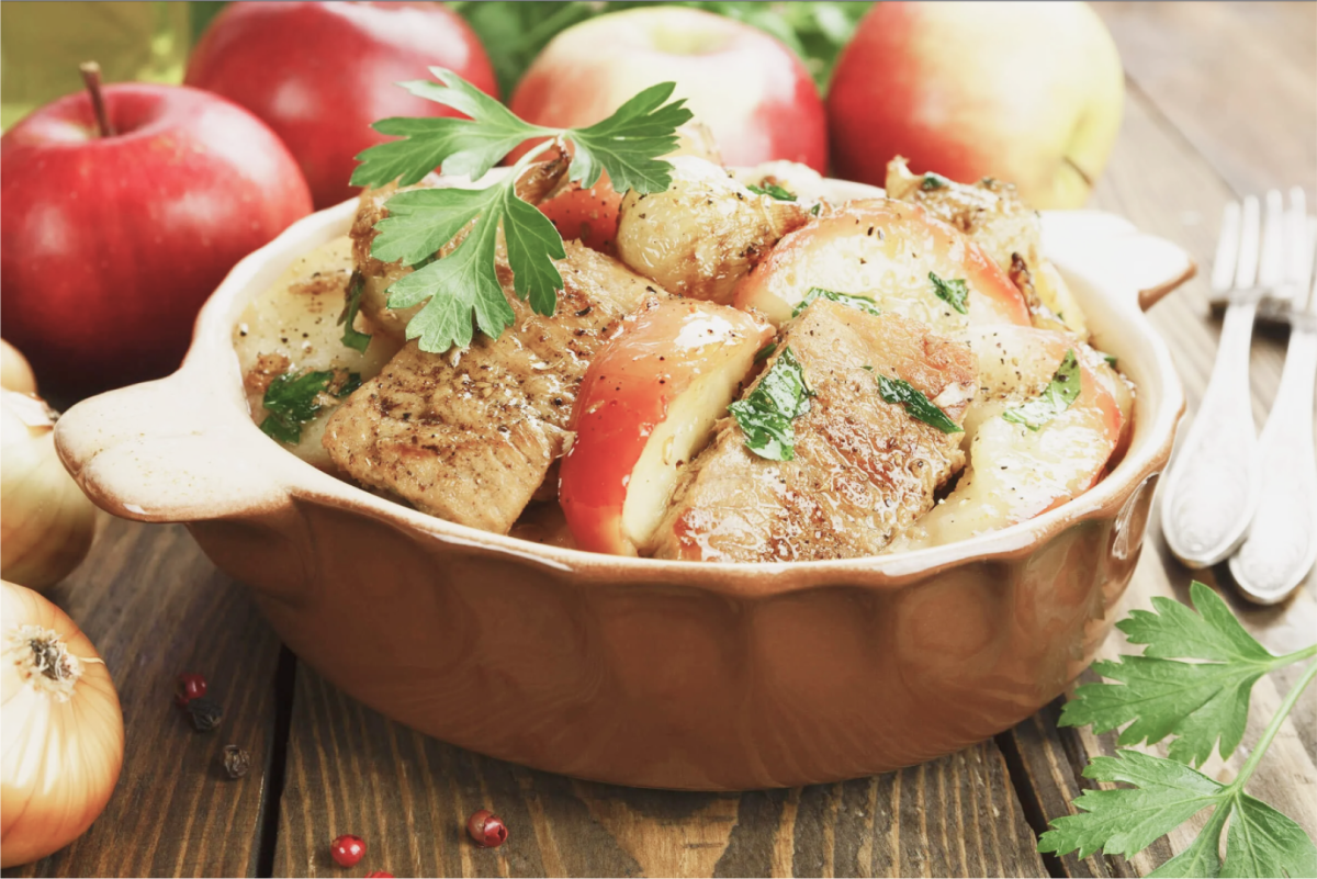 Дорогие пациенты, не забывайте радовать себя вкусной едой. Сегодня мы поделимся диетическим рецептом блюда из мяса с яблоками в молочном соусе. Оно скрасит ваш ужин.